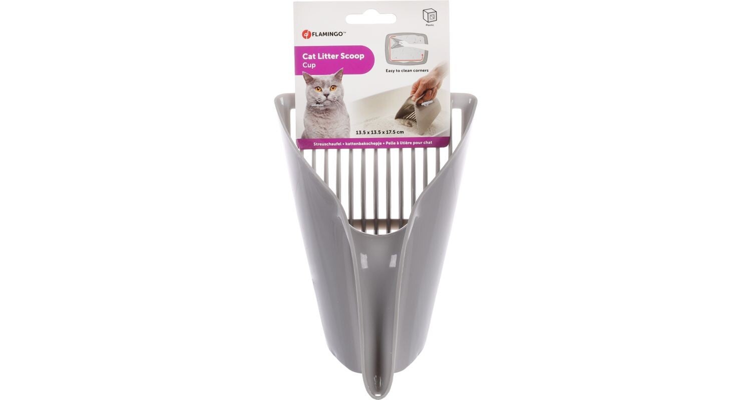 Flamingo Kattenbakschepje cupMateriaal: PlasticAfmeting: 13,5 cm l, 13,5 cm b, 13,5 hKleur: grijsArtikelnummer: 560595