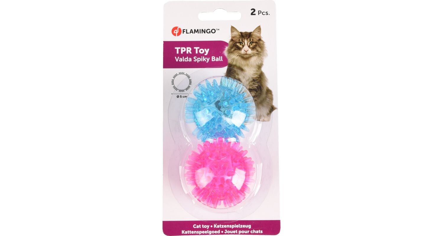 Flamingo kattenspeelgoed Valda spiky bal2 ballen in verpakkingMateriaal: tprAfemeting: 5 cm l x 5 cm b x 5 cm hØ: 5 cmKleur: blauw en rozeArtikelnummer: 560813