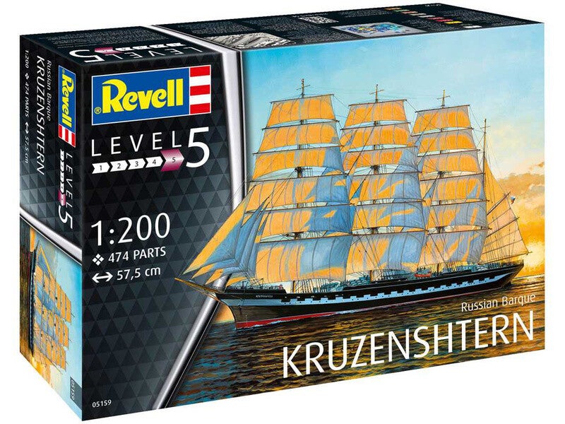 Revell Niveau:5 Russian Barque KruzenshternSchaal: 1:200Afmetingen: 57,5 cm LLeeftijd: 13+Onderdelen: 474art. nr. Revell05159