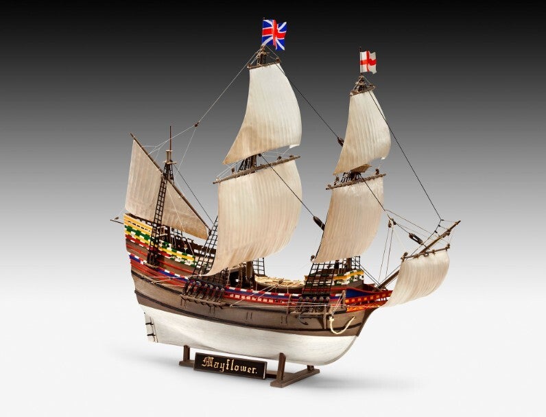 Revell Niveau:4 Mayflower - 400th Anniversary - Geschenkset - Limited EditionSchaal: 1:83Afmetingen: 36,7 cm L X 15 cm b X 29,8 cm LLeeftijd: 12+Onderdelen: 369art. nr. Revell05684