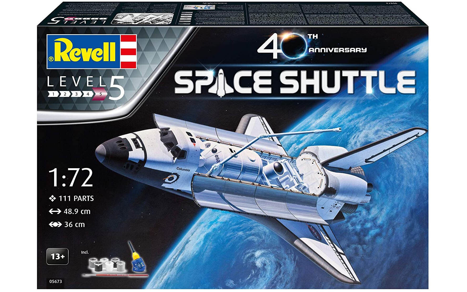Revell Niveau:5 Space Shuttle, 40th. Anniversary - Geschenkset - Limited EditionSchaal: 1:72Afmetingen: 48,9 cm L X 36 cm B X 22 cm HLeeftijd: 13+Onderdelen: 111art. nr. Revell05673