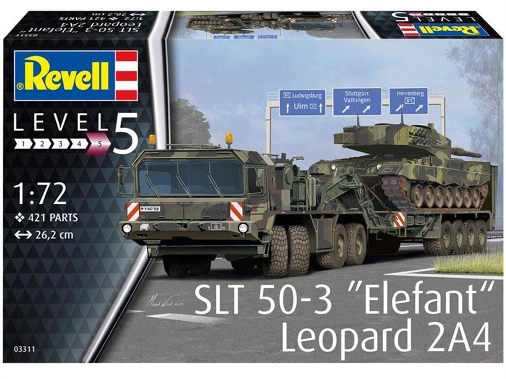 Revell Niveau:5 SLT 50-3 "Elefant" + Leopard 2A4Schaal: 1:72Afmetingen: 26,2 cm L X 5,9 cm B X 6,5 cm HLeeftijd: 13+Onderdelen: 421art. nr. Revell03311