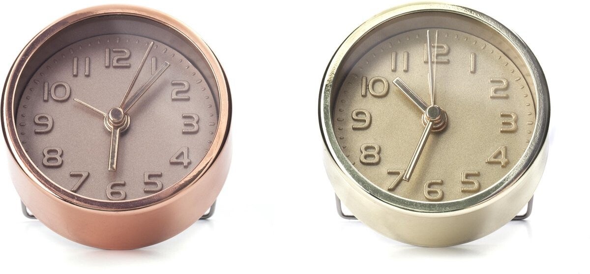 De goudkleurige wekker heeft een hoge rand. Modern design, met een praktische standaard aan de achterkant.