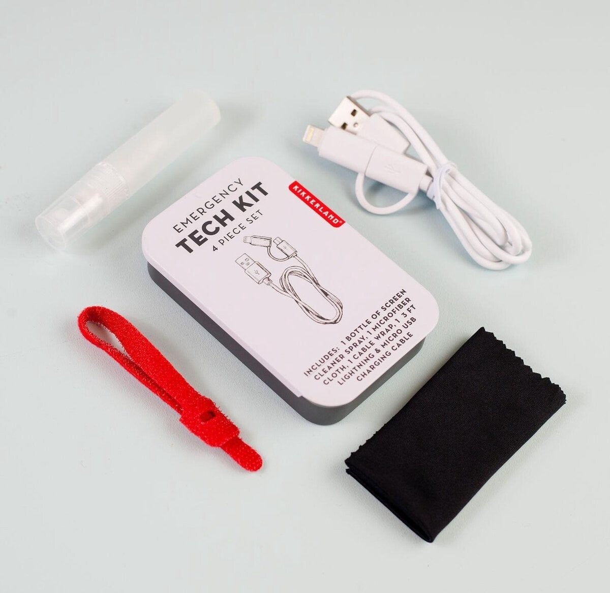 Reinig en organiseer uw technische benodigdheden onderweg! Deze handige set bevat: 1 microvezeldoek, 1 2-in-1 USB-kabel (3 ft), 1 rode kabelbinder en 1 fles 5 ml sprayreiniger.