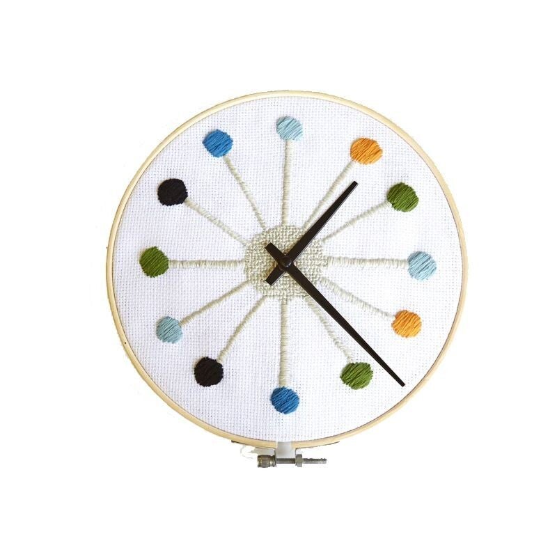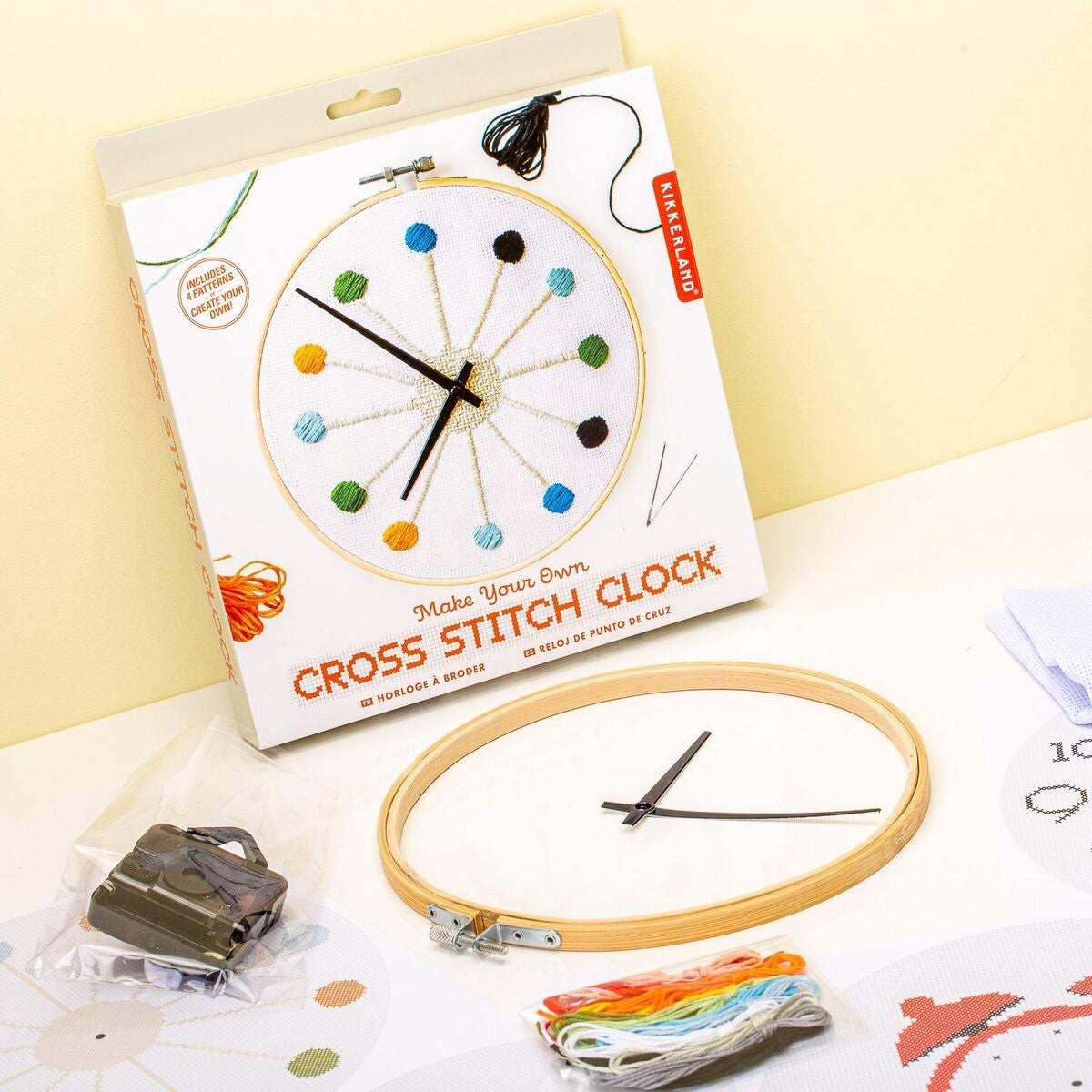 Klok met een wijzerplaat die je zelf kunt borduren. De klok bestaat uit borduurstof in een bamboering. Daarnaast zitten er 12 kleuren draad bij, een Quartz-uurwerk met wijzers, naalden, een achterkant en voorbeelddesigns die je kunt namaken.